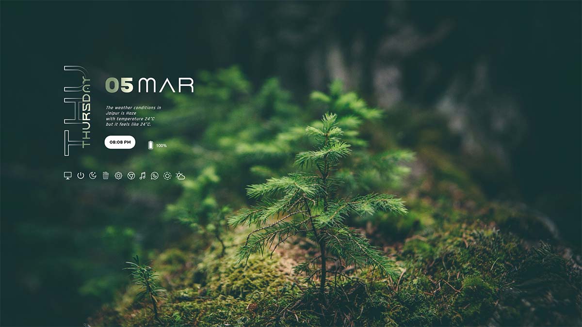 Sylva Rainmeter is a minimalistic rainmeter theme, which offers the essentials for a productive and clean looking desktop. It is coupled with a vibrant nature wallpaper which will give your desktop a refreshing feel. the skin will display your time and date, weather with detailed conditions, a battery percentage, and a dock / launcher. This skin was made by aochiocawhda on deviantart.